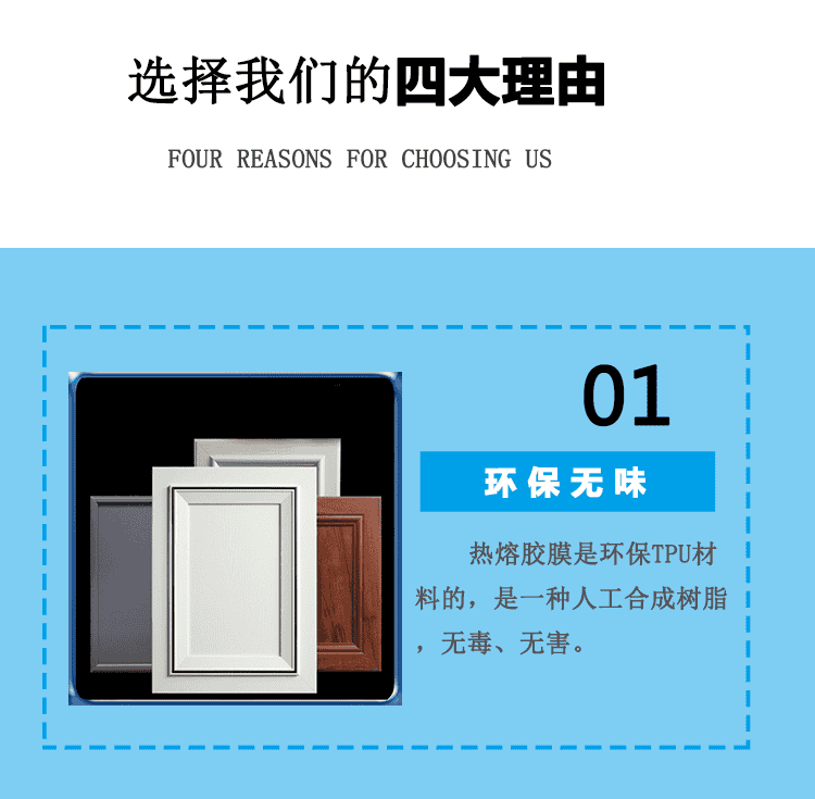 | 功能 | 主要用于吸塑門(mén)、模壓門(mén)替代噴膠工藝,直接將膠膜貼合在PVC裝飾膜的背面,節(jié)省人工、提高質(zhì)量的同時(shí)又能降低成本. |