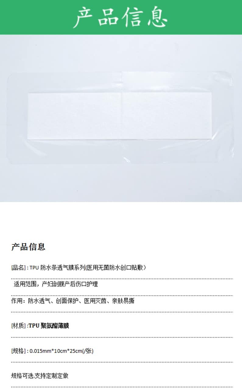 贊晨新材料,醫(yī)用防水透氣膜的作用具有防水透氣功能,在軍事、醫(yī)用、防戶外運(yùn)動(dòng)等領(lǐng)域中一直廣受關(guān)注。就如這款無(wú)菌產(chǎn)后敷貼,剖腹產(chǎn)后貼,保護(hù)剖腹產(chǎn)創(chuàng)口術(shù)后也能洗個(gè)安心...